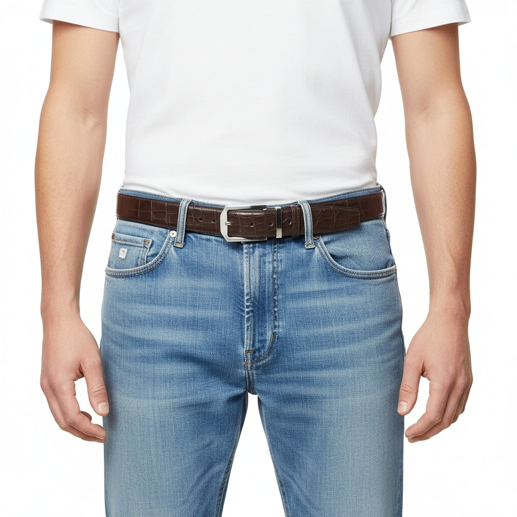 Sourced for its distinctive and sought-after pattern, genuine crocodile leather is the hallmark of high fashion and timeless luxury. Each scale tells a story of nature's artistry, making every belt a unique masterpiece. The deep Espresso Brown finish is hand-burnished to achieve a subtle gloss, enhancing the natural depth and dimension of the hide.